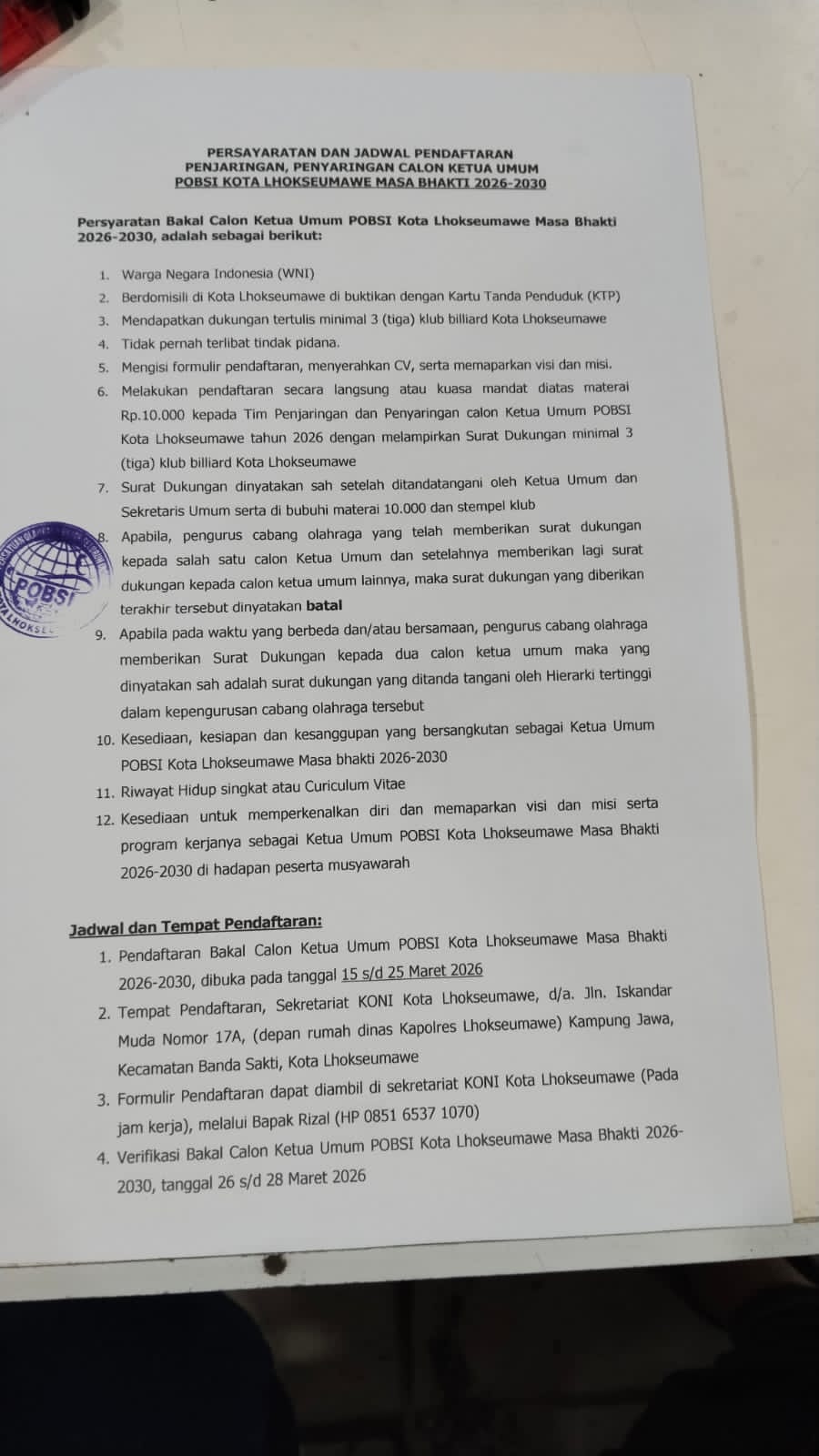 Rizal menjelaskan pendaftaran calon Ketum POBSI Kota Lhokseumawe dimulai dari 15-25 Maret 2026.Calon yang akan mendaftar dapat mengambil formulir di Sekretariat Koni Lhokseumawe atau melalui Tim Penyaringan (0851 6537 1070).Tim akan melakukan verivikasi calon Ketum pada 26 s/d 28 Maret 2026.